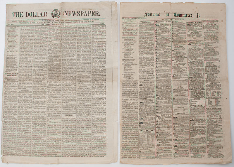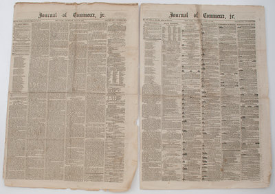 [With:] Journal of Commerce, jr. 3 issues (incomplete run). New York: N.p., 1861. Folio, 3 issues, numbering: Vol. XV, No. 6593,17 April 1861; Vol. XVI, No. 6672,18 July 1861; Vol XVI, No. 6697,16 August 1861. (Some toning, especially at folds.) Folio, 4pp., homefront affairs, mostly commercial including the arrival of ships. In No. 6672, the first paragraph begins: "We have just passed through a decade remarkable for brilliancy and the rapid growth of our country in wealth, the development of its resources and general progress. From our career of brilliant progress we appear suddenly at the close of the decade to have taken the retrogressive path and plunged into a condition of ruined fortune and the barbarous atrocities of civil war."