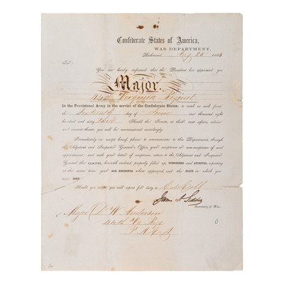 1p, 8 x 1/4 x 10 3/4 in., on "Confederate States of America, War Department" letterhead, scattered ink marks, approx. 2 in. tear at left bottom edge, creasing at folds. Seddon appoints David W. Anderson (1828-1903) a major in the 44th Virginia Regiment.