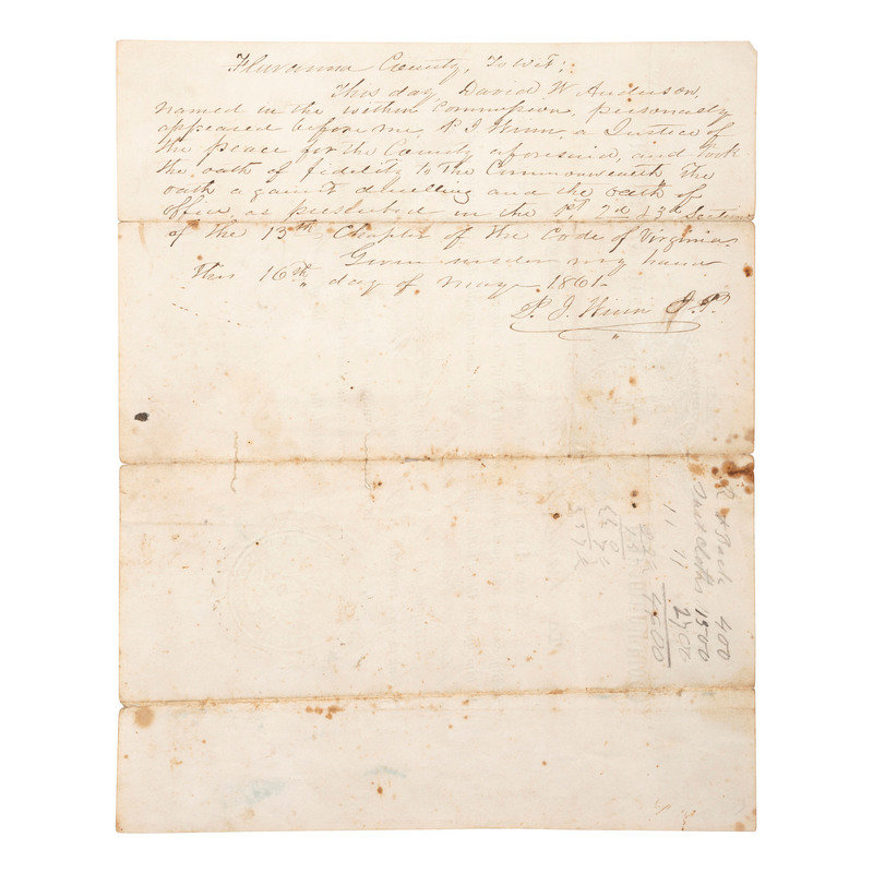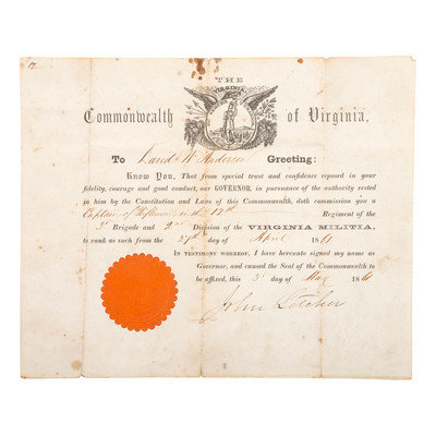[With:] LETCHER, John (1813-1884). Document signed ("John Letcher") as Virginia Governor. [Richmond], 3 May 1861. 1p, 9 5/8 x 7 3/4 in., large ink blots near top center, toning, heavy creasing at folds. Letcher commissions David W. Anderson Captain of Riflemen in the 12th Regiment of the 3rd Brigade and 2nd Division of Virginia Militia.