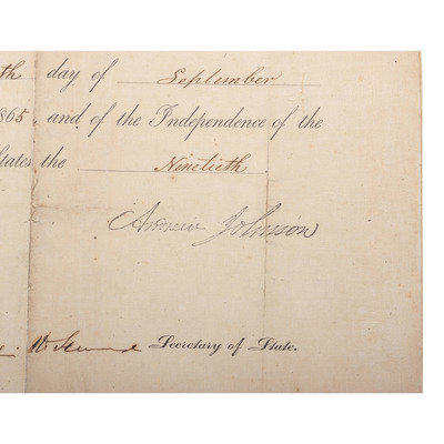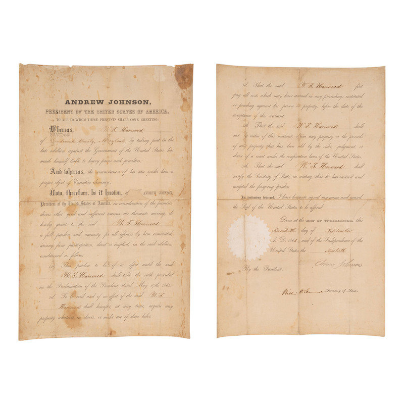 [CIVIL WAR]. JOHNSON, Andrew (1808-1875). SEWARD, William H. (1801-1872). Partly-printed Presidential pardon stamp-signed ("Andrew Johnson") and signed ("WIll. H. Seward") for W.T. Harwood. Washington DC, 20 September 1865.
