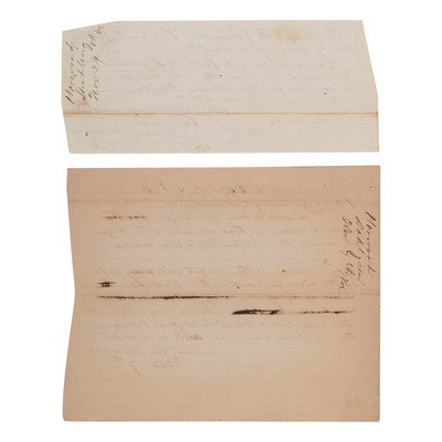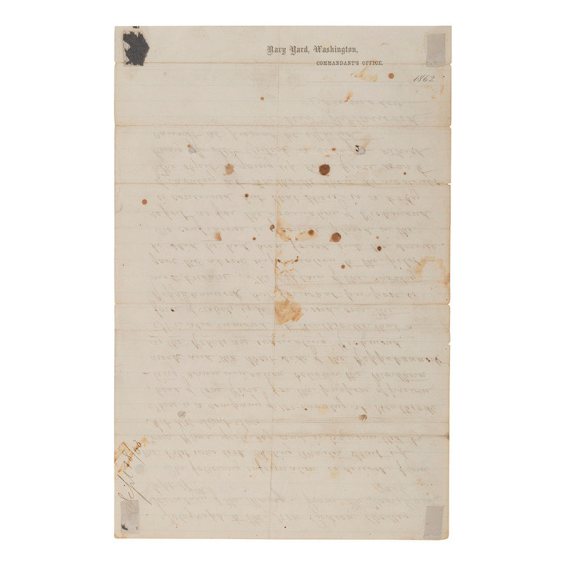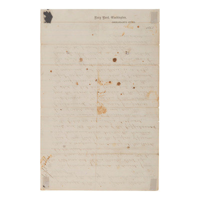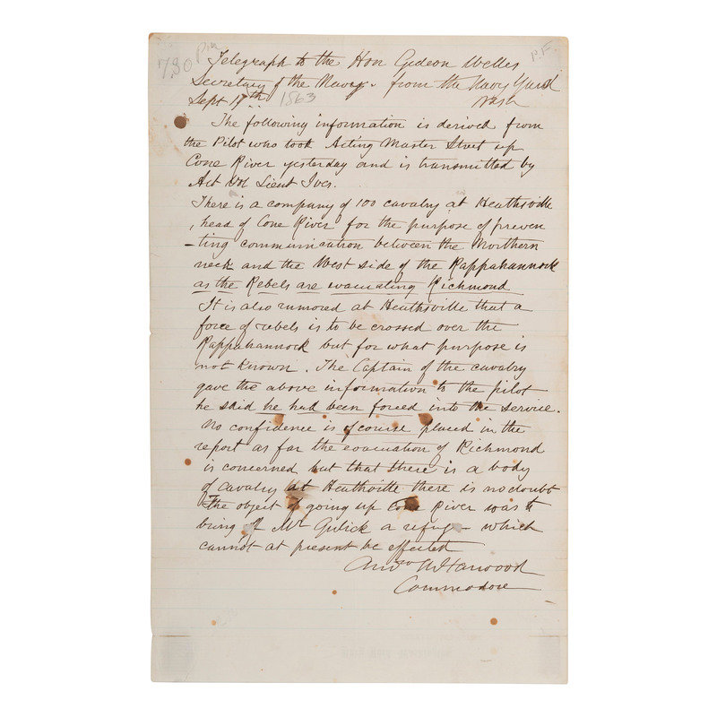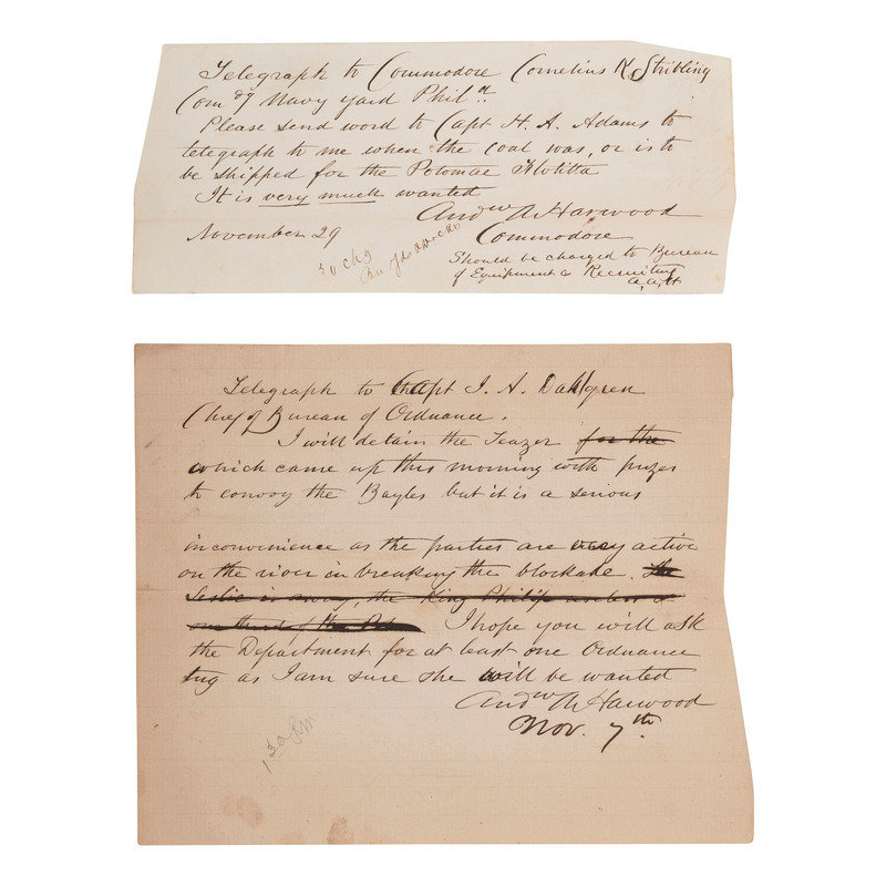 HARWOOD, Andrew A. Text of a telegraph signed ("Andw. A. Harwood"), to Chief of Bureau of Ordnance Captain John A. DAHLGREN (1809-1870), n.p., 7 November 1862. 1p, 7 1/2 x 6 1/4 in., light soil, toning. “I will detain the Teazer [sic] which came up this morning with prizes to convoy the Bayles but it is a serious inconvenience as the parties are very active on the River in breaking the blockade. I hope you will ask the Department for at least one ordnance tug as I am sure she will be wanted.” The Teaser was a Confederate tug captured by the Union on 4 July 1862, repaired, and put into service. -- Text of a telegraph signed ("Andw. A. Harwood / Commodore"), to Commodore Cornelius K. STRIBLING (1796-1880), Commander of the Philadelphia Navy Yard, 29 November 1862. 1 p. 7 3/4 x 3 3/8 in., light soil, creasing at fold. “Please send word to Capt. H. A. Adams to telegraph me when the coal was, or is to be shipped for the Potomac Flotilla. It is very much wanted.” -- Text of a telegraph signed ("Andw. A. Harwood / Commodore"), to Gideon WELLES (1802-1878), Secretary of the Navy, Washington Navy Yard, 17 April 1863. 1p, 8 x 12 1/2 in., light soil, scattered ink marks. Telegraph relays intelligence report and news of a rumored evacuation of Richmond, reading in part: “There is a company of about 100 cavalry at Heathsville, head of Cone River for the purpose of preventing communication between the Northern Neck and the West side of the Rappahannock as the Rebels are evacuating Richmond...No confidence is of course placed in the report as far as the evacuation of Richmond is concerned..."