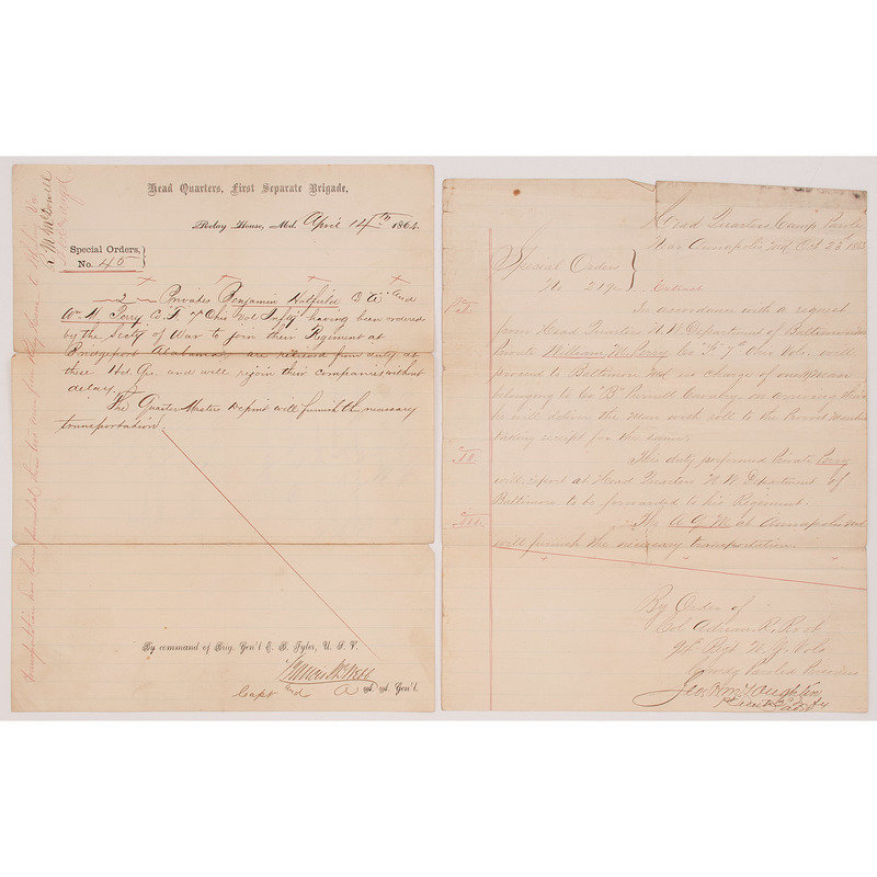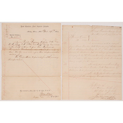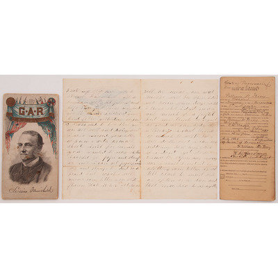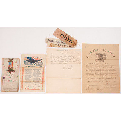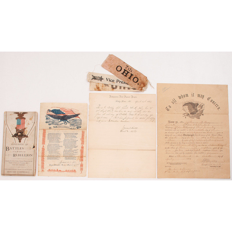 Approximately 12 items including documents and ephemera related to the Civil War service of Private William M. Perry (1842-1916), Co. F, Ohio 7th Volunteer Infantry. Perry enlisted on 20 June 1861 at Camp Dennison, Ohio. He was taken prisoner at Dumfries, VA, on 27 December 1862, paroled 7 January 1863, and mustered out with his company 6 July 1864. The collection is highlighted by the following: a soldier's letter written on June 28, 1862, from "Camp Manasses" on beautifully printed, full-page "Hero's Memento" songsheet letter paper, with blue ink, red border, and eagle and flag motif; two separate special orders dating from 1863 and 1864 with directives to furnish transportation to Private Perry, one for the transport of a prisoner; GAR ribbons, and most notably the "Hand-Book of Battles of in the War of the Rebellion" published by the Illinois Central Railroad Co. in 1887 with a dedication to the Grand Army of the Republic and featuring a timeline of battles of the Civil War.