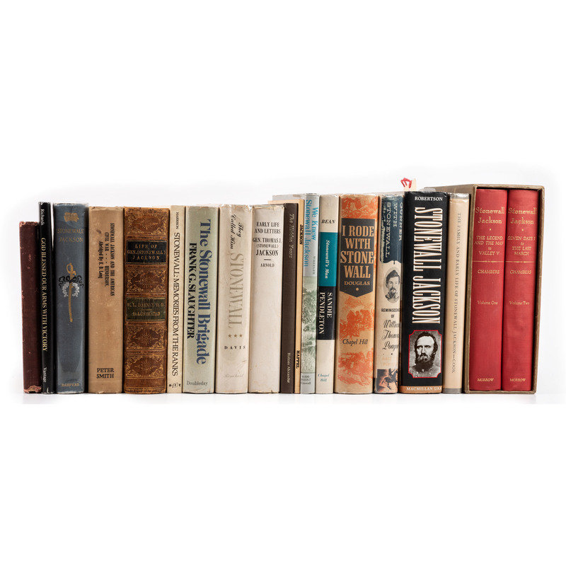 DABNEY, Robert Lewis. (1820-1898). Life and Campaigns of Lieut.-Gen. Thomas J. Jackson, (Stonewall Jackson). New York: Blelock & Co., 1866. (Scuffed, upper hinge broken). -- JACKSON, Mary Anna (1831-1915). Life and Letters of General Thomas J. Jackson (Stonewall Jackson). New York: Harper & Brothers, 1891. -- POAGUE, William Thomas (1835-1914). COCKRELL, Monroe F. (1884-1972), editor. Gunner with Stonewall. Reminiscences of William Thomas Poague. Jackson, TN: McCowat-Mercer Press, Inc., 1957. SIGNED BY COCKRELL. -- BEAN, William Gleason. (1891-1974). Stonewall's Man Sandie Pendleton. Chapel Hill: The University of North Carolina Press, 1959. -- CHAMBERS, Lenoir (1891-1970). Stonewall Jackson. New York: William Morrow & Co., 1959. 2 volumes. -- And 13 others. Together, 18 works in 19 volumes, 8vo, condition generally good.