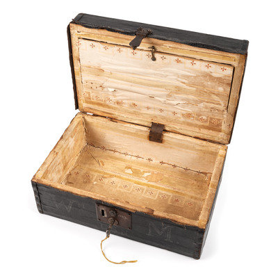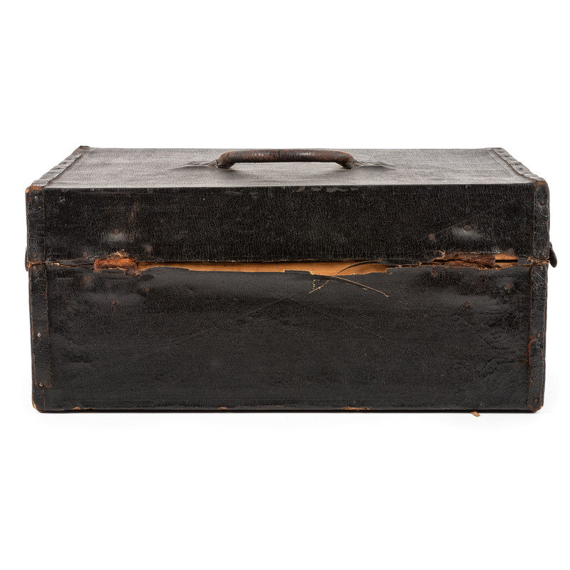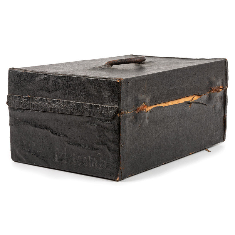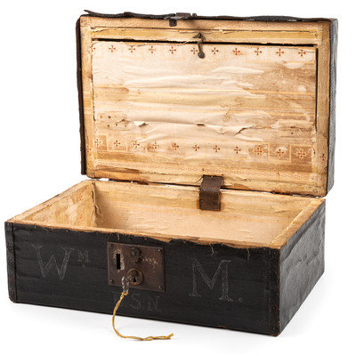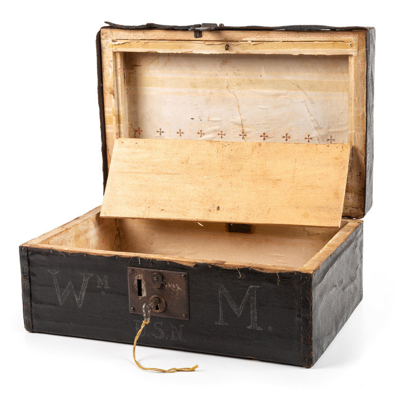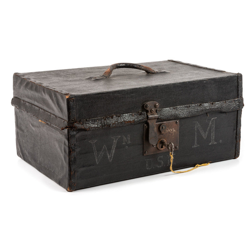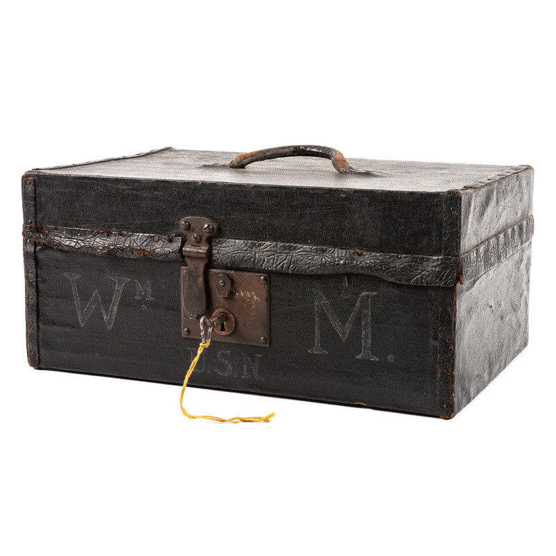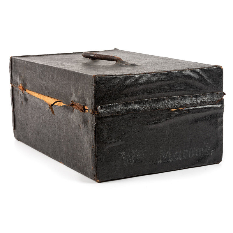 14 x 9 x 6 1/4 in. (losses to interior paper lining, wear to leather, original leather straps connecting to lid no longer present). Functioning lock with key inside. Identified on front panel "Wm. M. / U.S.N." and on both side panels "Wm. Macomb." Undated, likely not military issue.