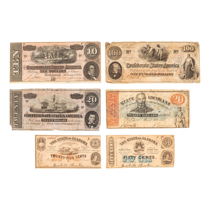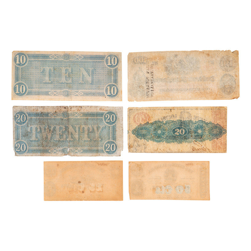 [CIVIL WAR - CURRENCY]. A group of 6 Confederate currency notes, comprising: