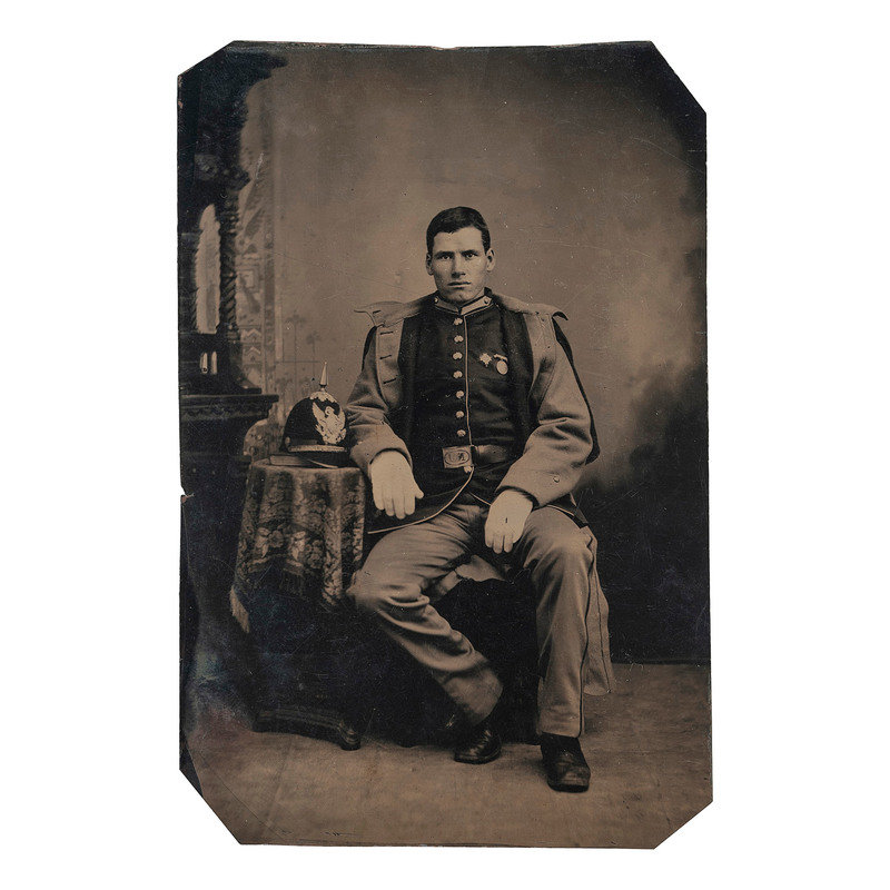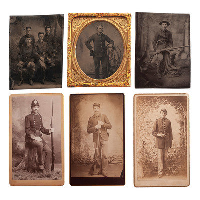 Studio portrait of a seated military officer in uniform. N.p.: N.p., n.d. 4 x 6 in. tintype. The man is casually seated with his dress overcoat open to reveal his uniform with two medals on his breast. He wears white gloves and his M1881 (spike) dress helmet rests on the table next to him. -- Studio portrait of a sergeant, possibly a medical officer. N.p.: N.p., n.d. Sixth plate tintype (abrasions to left); housed with brass mat, frame, and glass. The officer stands wearing his frock coat with sergeant stripes. He holds a cap that appears to have a medical cross insignia. -- Studio portrait of a soldier holding a rifle. N.p.: N.p., n.d. 2 7/16 x 3 1/2 in. tintype. With one leg resting on a prop, he holds his rifle with both hands. A handgun is tucked into his belt filled with ammunition. -- Studio group portrait of 4 young infantrymen, including a bugler. N.p.: N.p., n.d. 2 1/2 x 3 3/8 in. tintype. Two stand and two sit in front of a painted backdrop, all wearing their frock coats and kepis with infantry insignia. One of the infantrymen holds a bugle on his knee. -- Together, 4 tintypes, light surface abrasions, occasional bends to plates.