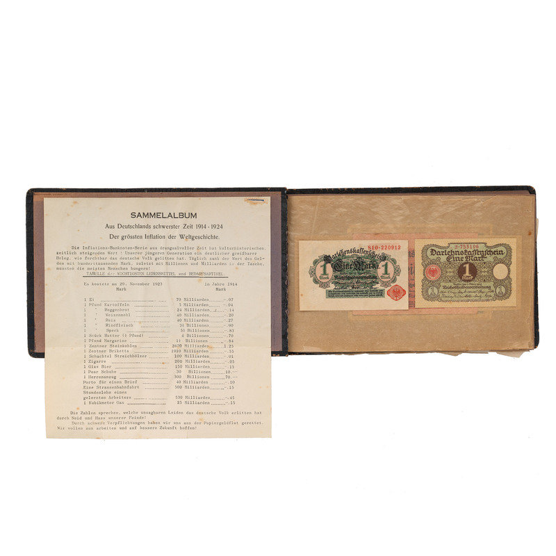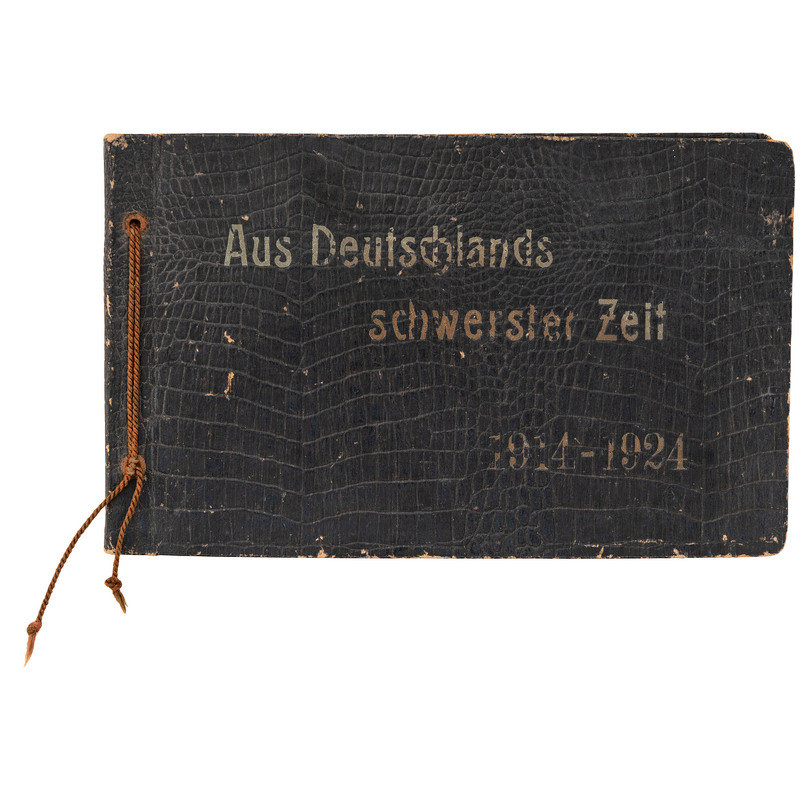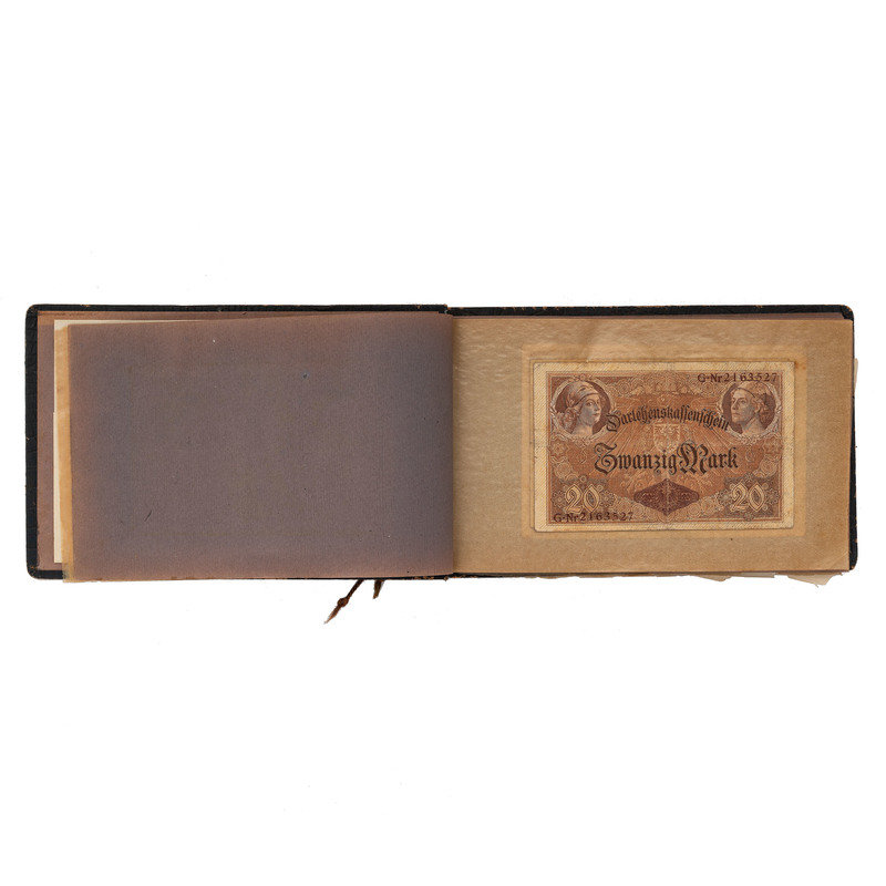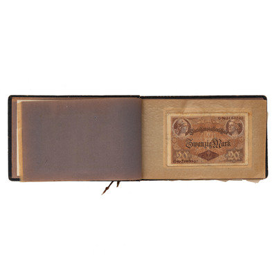 [From Germany's Hardest Time 1914-1924] In German. Leaves with samples of banknotes/paper currency from the decade. Obl. 5.75 x 9.5 in. Leather boards with gilt lettering. Spine with metal tubes, silk string through the holes. Leaves consist of glassine, with a heavy lavender paper leaf every fifth leaf. This volume has 98 leaves used, pages 1 and 3 each have two small banknotes, making the total number of notes 100.