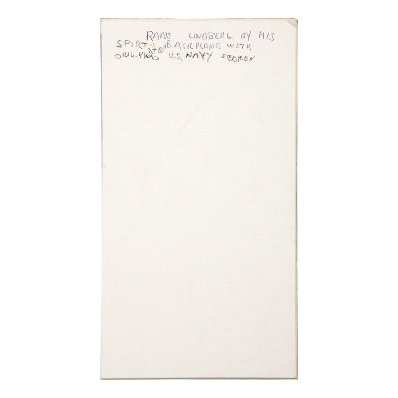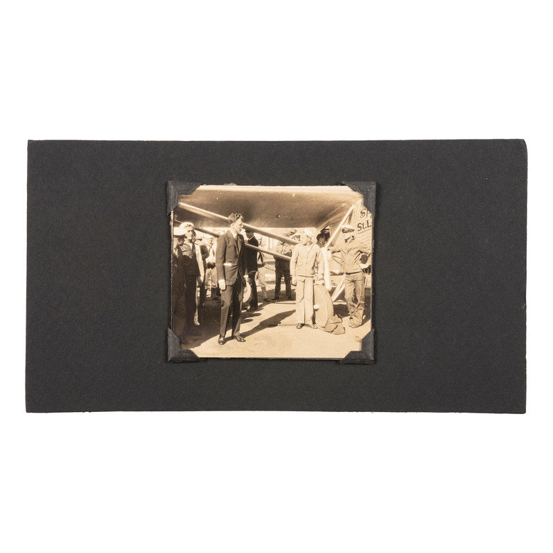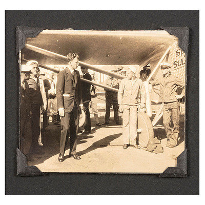 Albumen photograph on cardstock mount of Charles LINDBERGH (1902-1974) standing in a group near his plane the Spirit of St. Louis. N.p.: n.p., n.d. [ca 1927]. 3 x 2 ¾ in. (faint scratches to surface). -- A group of 9 images depicting the Apollo 11 spaceflight and crew. N.p.: National Aeronautics and Space Administration, n.d. 8 x 10 in. (light soil, toning).