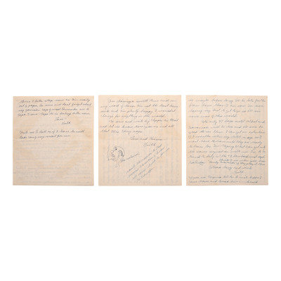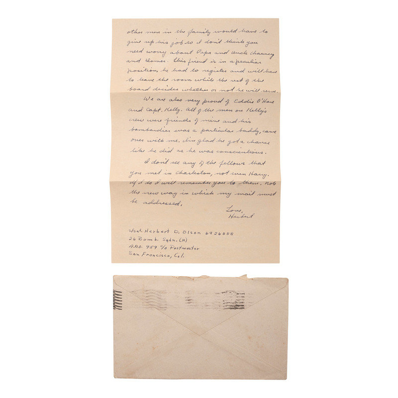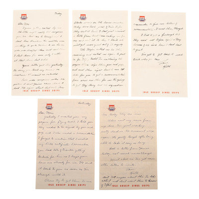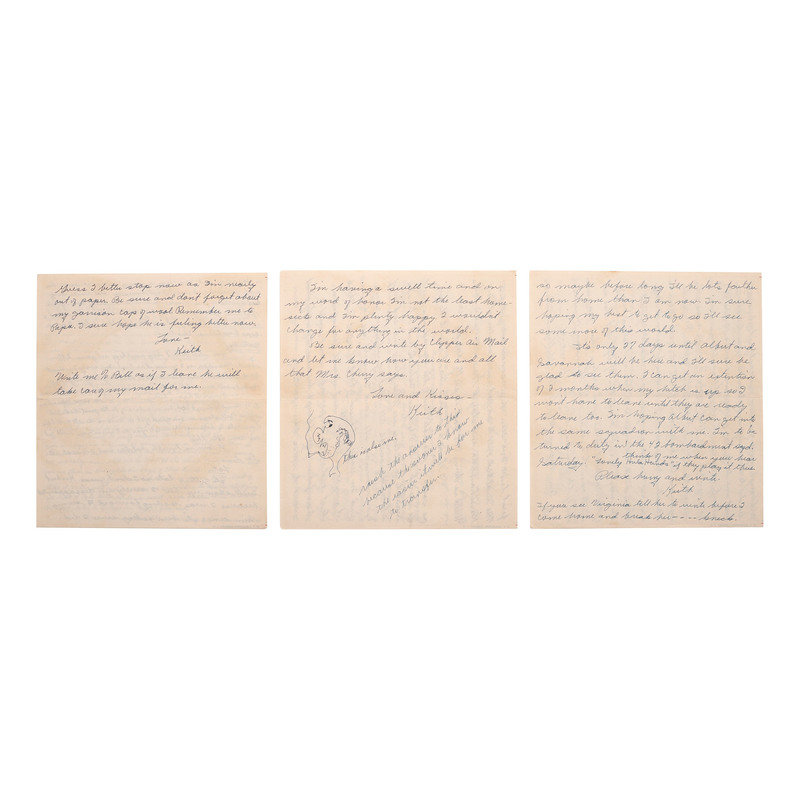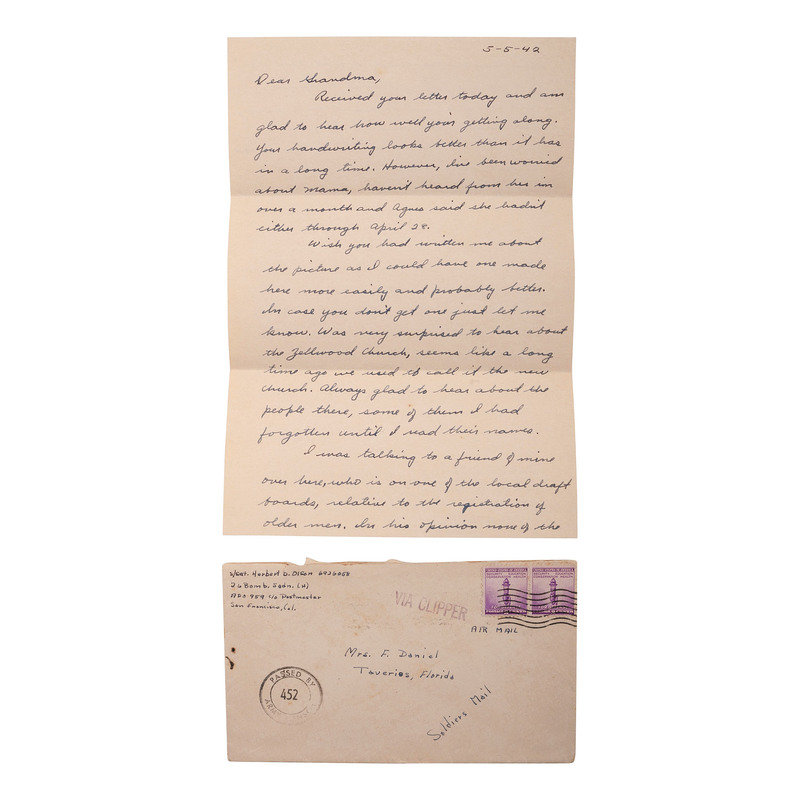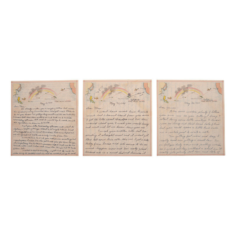 The earliest correspondence dates to May 1940 and includes three letters written by Keith shortly after arriving in Hawaii following his pre-war enlistment, each written on letterhead featuring a color illustration of the Trans-Pacific Air Mail route across the Pacific Ocean. Two of these letters specifically identify transport via the California Clipper. An American long-range flying boat operated by Pan American Airways, the California Clipper was produced for commercial flight. Following the 1941 entry of the US into WWII, the California Clipper was utilized by the US military for ferrying personnel and equipment to the fronts, retiring in 1946 with more than a million flight miles.