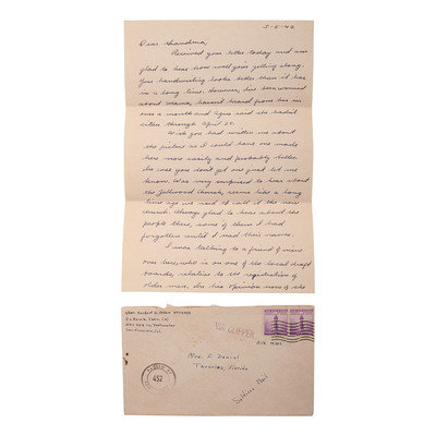 Correspondence from 2 identified soldiers, Keith R. Olson (1921-1988) and Herbert D. Olson (1917-1970), brothers born in Clearwater, Florida. Herbert served with the 26th Bomb Squadron during World War II while Keith served with the 3rd Anti-Submarine Squadron. Letters in the collection are written to their mother, grandmother, and sister.
