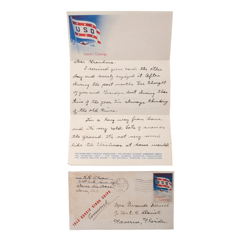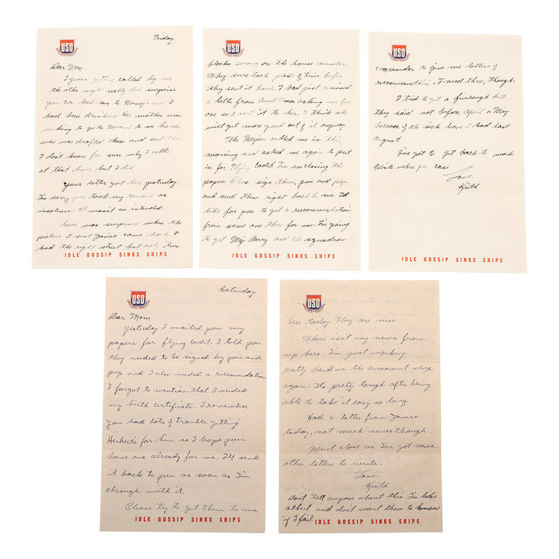 Additional correspondence includes three war-date letters, one of which is written on USO "Season's Greetings" letterhead and another on USO letterhead with "Idle Gossip Sinks Ships" printed on bottom. Letters discuss general military life and family matters, though an undated letter from Keith discusses his displeasure with a new crew replacing his crew: "They are trained for high altitude work but know nothing of ours. We had to fly with them and teach them how to do it so they could take our place. That hurt. On anti-sub patrol we bomb with a speed of about 200 MPH but an altitude of only from 50 to 70 feet off the water. That is too fast and low for any sight made. It takes lots of guts to fly like that too. Everyone hates the new fellows..."