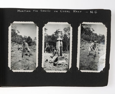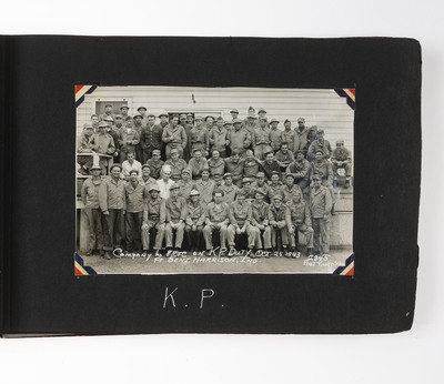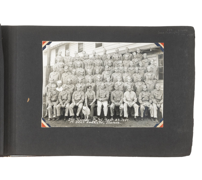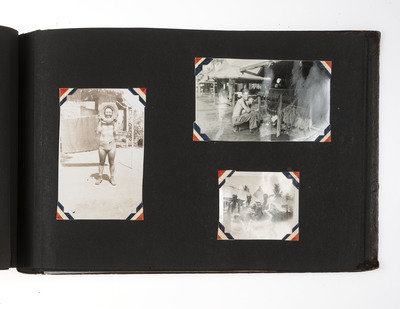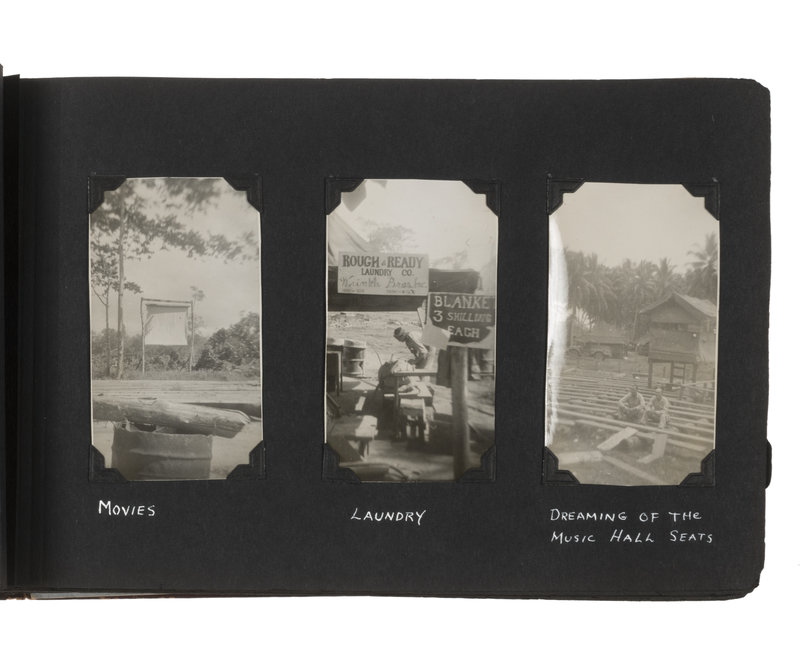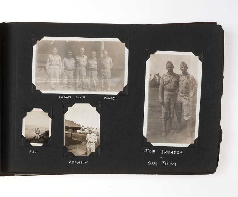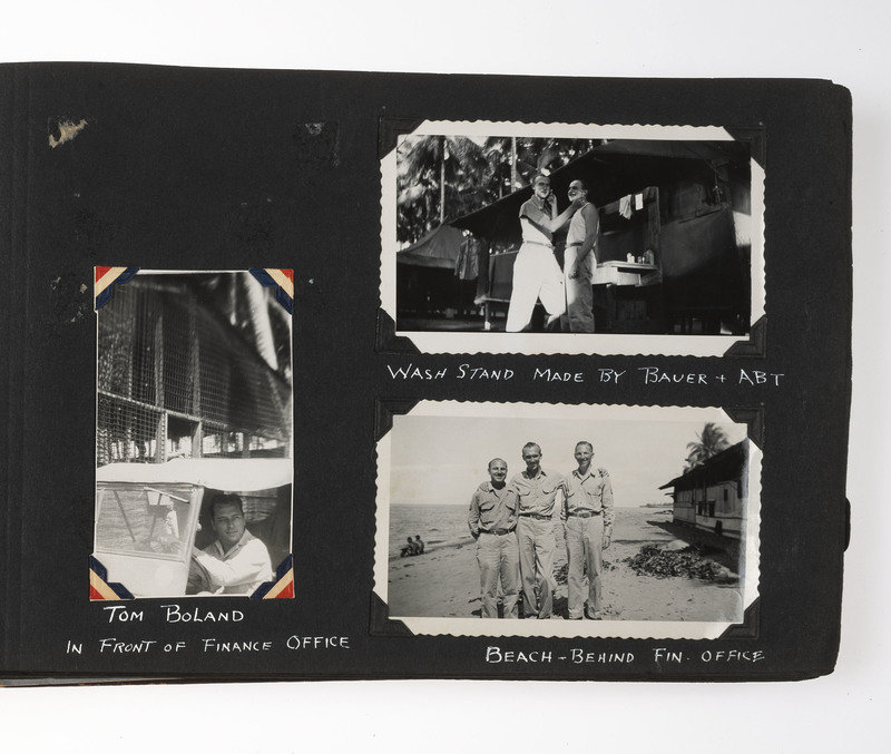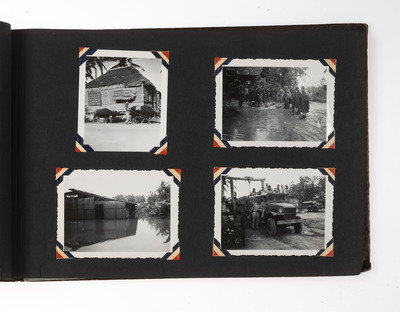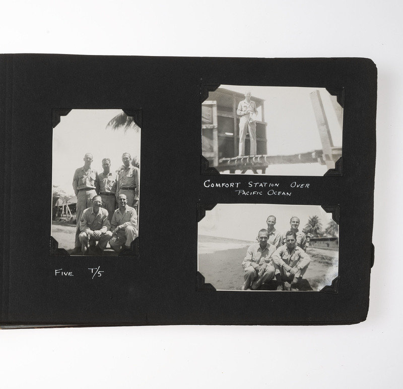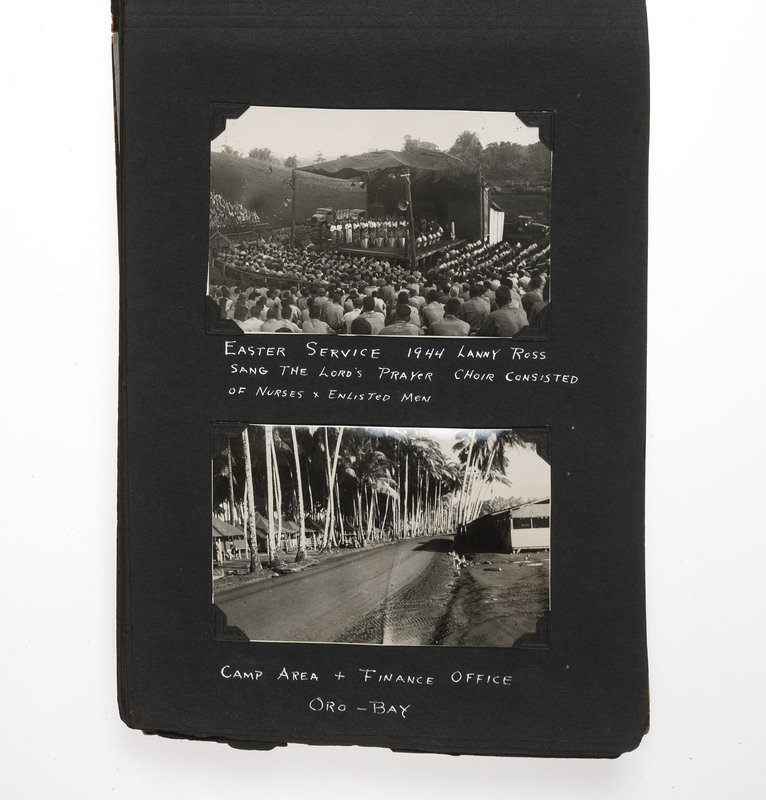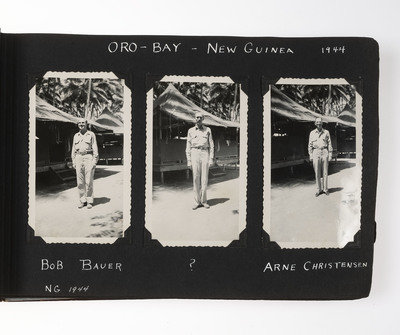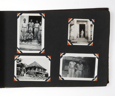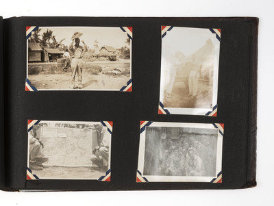 An extensive record of American military and local life in New Guinea and the Philippines during World War II from the perspective of an Indiana private. The first two photos comprise group portraits of two platoons on KP duty at Ft. Benjamin Harrison, IN, in September and October 1943; the preponderance of photos, however, is from 1944 and 1945. The first series of images depict the enlisted men and several scenes of their base at Oro Bay, New Guinea. These include portraits, activities about the camp (including a snail hunt and an Easter service), and many images of natives, their villages, and children, some of whom, according to the captions, are afflicted with malaria. The majority of the album chronicles experiences in Tacloban, wider Leyte, and nearby areas of the Philippines. Though there are some portraits and images of army men at work, most of the photos record the city, its architecture, and surroundings, and include numerous shots of locals, their activities, and their environment. There are also several photographs of the newly built MacArthur School, and agricultural and river scenes. Several of the captions are less than kind, such as two striking images of downed warplanes in New Guinea with the caption “Two Less Japs," a page of pictures of half-clothed New Guinean women referred to as "some of the local belles," and a reference to Tacloban as "the so-called town." Nevertheless, this is an album that represents an excellent photographic record of military and native life in New Guinea and Leyte during the war.