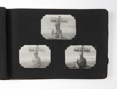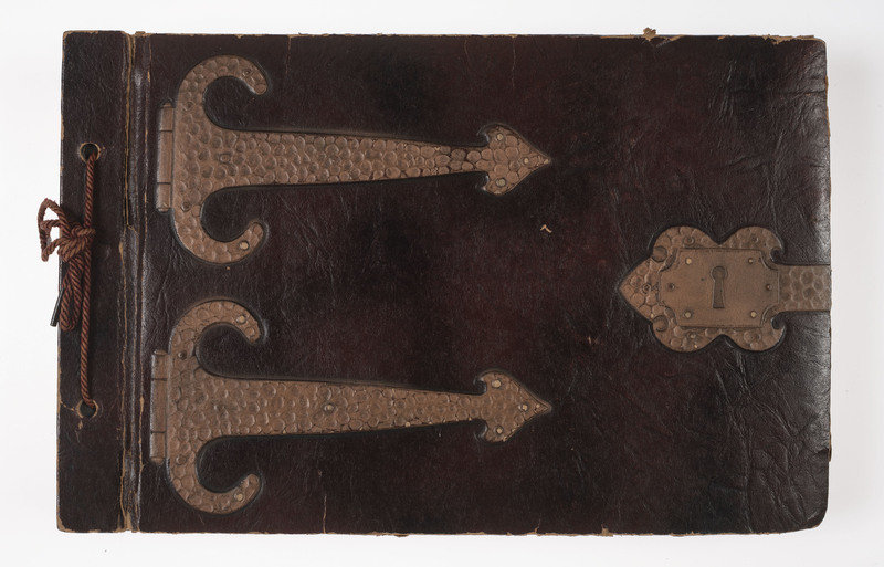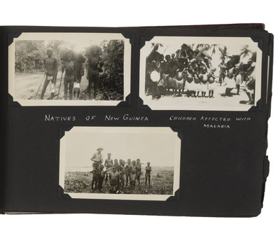 Original leather album, 7 1/4 x 11 1/4 in., embossed in gilt, string tied, containing 190 original silver gelatin photographs ranging in size from approx. 2 1/2 x 4 in. to 3 x 4 1/2 in., and are displayed in corner mounts. The first half of the album is extensively captioned in white ink.