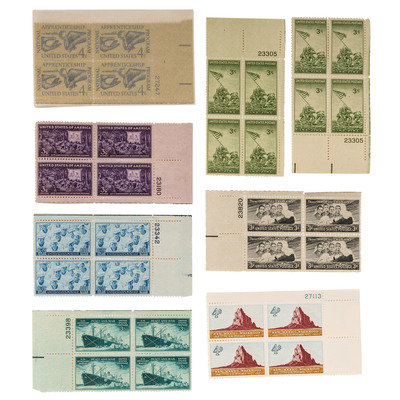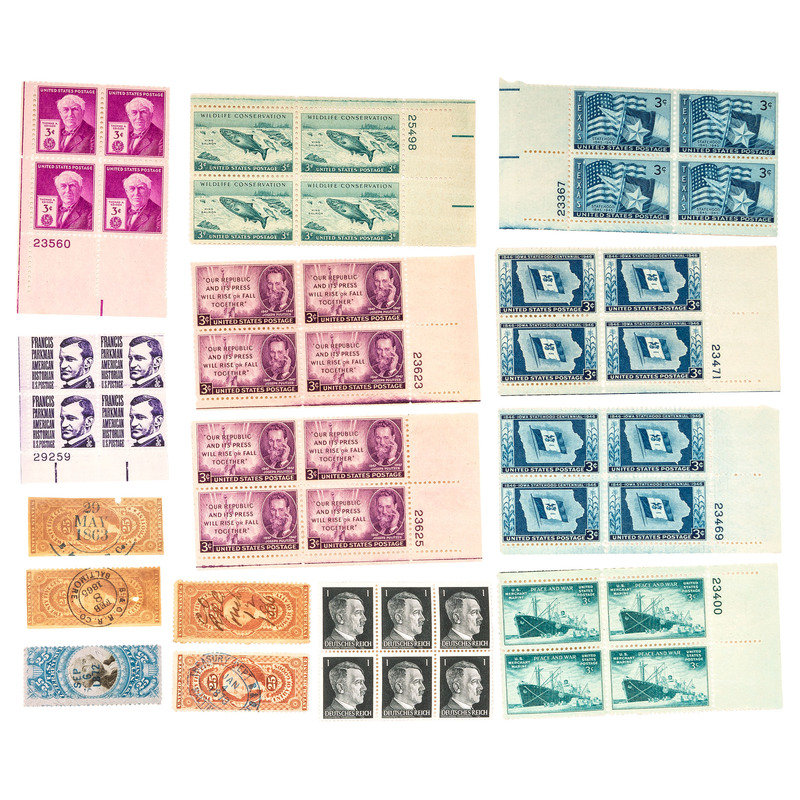 [With:] Block of 6 German stamps, “Deutsches reich.” -- 5 Internal Revenue stamps, each 25 cents, all of these used with dates of 29 May 1863, 8 Feb. 1865; 12 March 1866; Jan. 4, 1873; and Sept. 6, 1872. -- 17 “blocks” of four stamps each, unused, all 3 cents: Thomas A. Edison; Francis Parkman; Texas Statehood; Iowa Statehood Centennial (2); New Mexico Statehood; Apprenticeship; Joseph Pulitzer (2); Wildlife Conservation; U.S. Merchant Marine (2); These Immortal Chaplains; Iwo Jima (2); U.S. Navy; and 50th Anniversary of Motion Pictures.