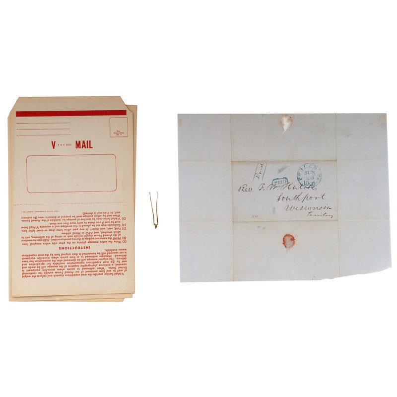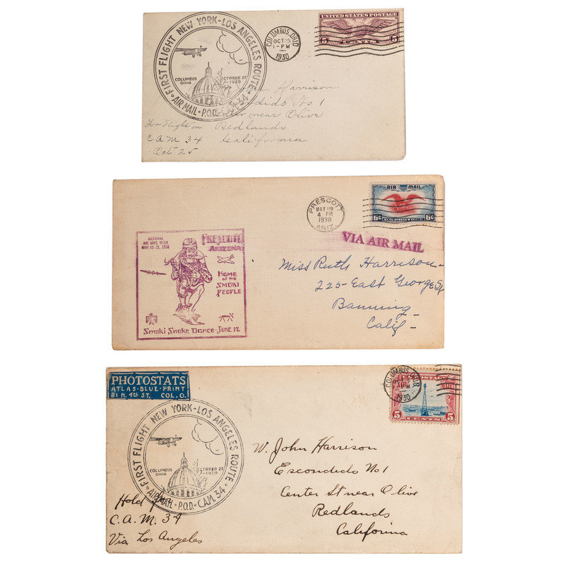 -- Three blank V-Mail forms from WWII. -- Blank early airmail envelope. -- Two FDCs with cache of First Flight New York- Los Angeles Route Air Mail P.O.D. C.A.M. 34. Oct.25, 1930. One has an airmail stamp, the other a different stamp. -- FDC with ”National Air Mail Week, May 15-21, 1938. Cache of Smoki Snake Dance, June 12. Prescott, Arizona, “Home of the Smoki People.”