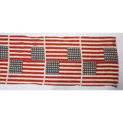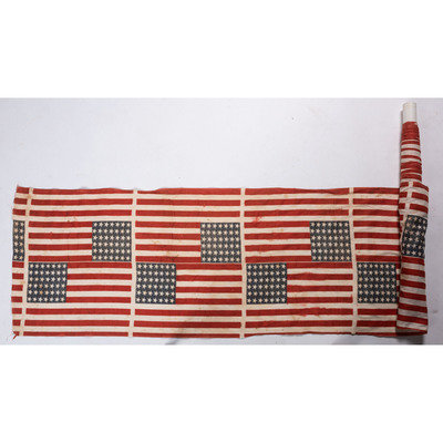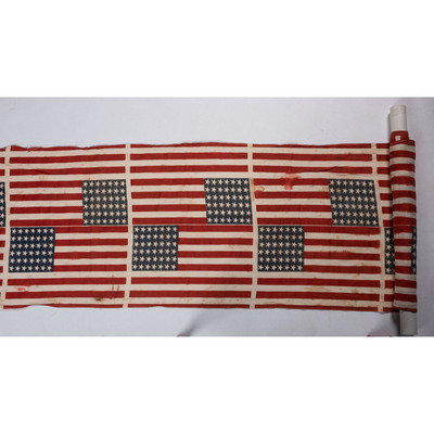Bolt includes 24 complete 42-star flags printed on cotton (light soil and scattered discoloration, fraying at edges). Each complete flag features a 7/7/7/7/7/7 star pattern on canton, and measures 17 x 12 in.; 210 x 23 1/2 in. overall.