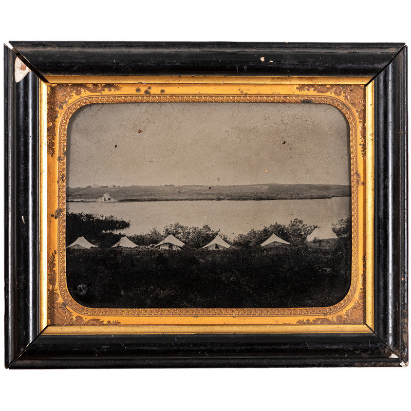 Full plate outdoor ambrotype, framed (crackling, flaking, and spots of loss to emulsion, with oxidation to mat, unexamined out of the frame). Scene includes 6 tents set up before a large lake or river, with what appears to be farmland on the opposite side.