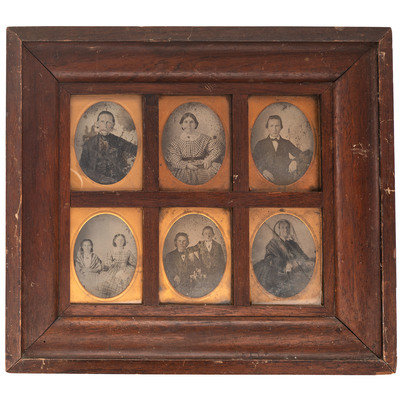 [EARLY PHOTOGRAPHY - PORTRAITURE]. A Daguerreian wall frame containing 6 quarter plate tintypes, with additional frames and mats, including: