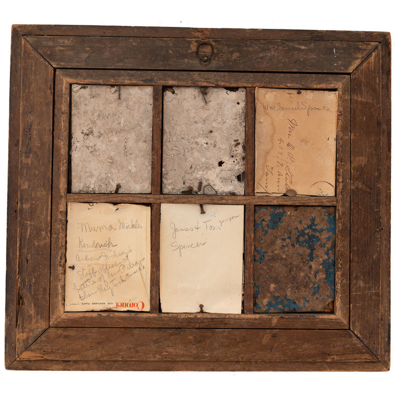 6 uncredited quarter plate ambrotypes of members of the Spencer family, most identified by pencil inscriptions on verso. Framed to 15 1/2 x 14 in. Condition varies, with heavy deterioration including large crack in glass to bottom right portrait; all unexamined out of the frame.