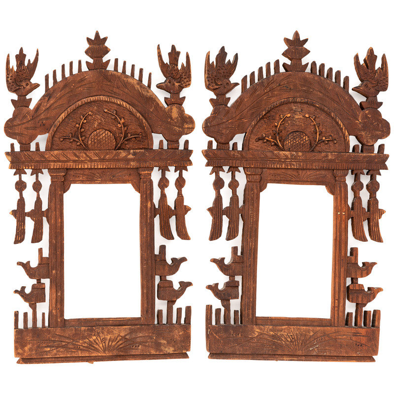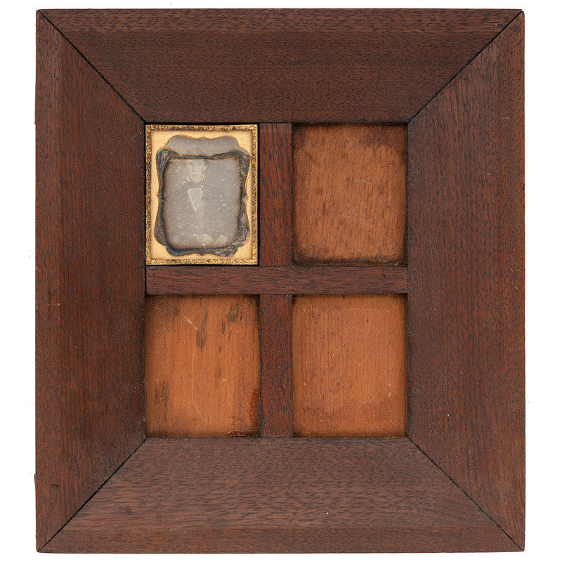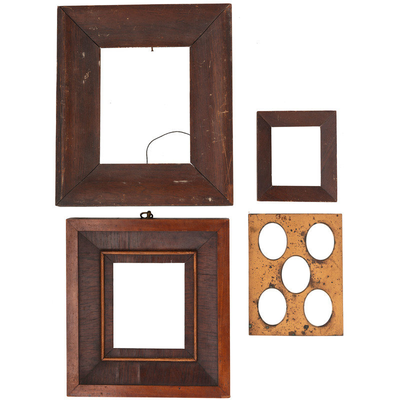 [With:] Daguerreian wall frame with 9 spaces for sixth plate portraits, 16 1/8 x 14 1/2 in. -- Daguerreian wall frame with 4 spaces for ninth plate portraits, 8 5/8 x 9 1/2 in., containing one uncredited ninth plate daguerreotype portrait of a man. -- And 6 other frames, including 2 ornate wooden frames for CDV-sized portraits. -- Together, 8 items. Condition generally fair, glass not present in most.