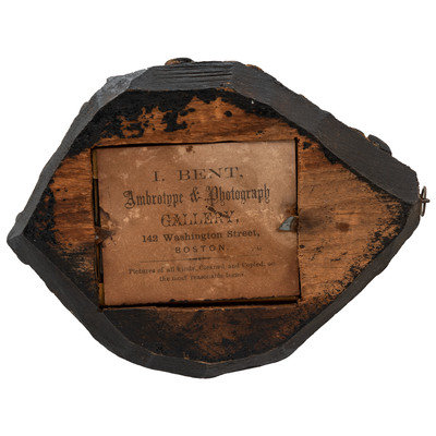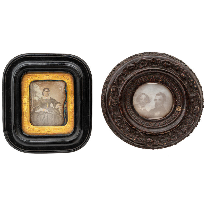 A quarter plate ambrotype portrait of a middle-aged and full-figured woman. N.p.: n.p. n.d. (Crackling and some loss to emulsion, spotting to mat and preserver.) Housed in a Very Rare geometric union wall frame [Berg 7-18] (soiling throughout, with one noticeable spot of finish loss along lower edge). -- A quarter plate tintype portrait of a woman wearing earrings and a striped necktie. N.p.: n.p., n.d. (Light blemishes to plate, spotting to mat, and soiling/discoloration to preserver.) Housed in a Rare geometric union wall frame [7-21] (light soiling and nicking throughout). -- A ninth plate daguerreotype portrait of a young woman wearing a necklace. N.p.: n.p., n.d. (Heavy tarnishing to edges, some clouding and blemishing to plate.) Housed in an oval wall frame with hanging hardware attached at top (heavy wear including cracking, chipping, and loss to finish along some raised surfaces). Accompanied by advertising card for "I. Bent, / Ambrotype & Photography / Gallery, / 142 Washington Street, / Boston." -- And 2 others, including one quarter plate daguerreotype of a lovely young woman with a fan and a quarter plate daguerreotype of a couple posed affectionately, both housed in wall frames. Conditions vary.