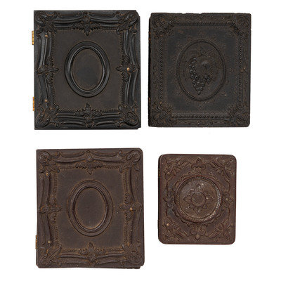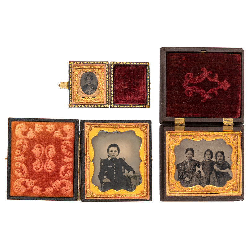 Sixth plate ambrotype portrait of a young boy with long hair seated in a chair. N.p.: n.p., n.d. (Tarnishing along mat opening, with some spots of emulsion loss; unsealed.) Housed in a pressed paper case (fully separated at spine, with surface wear throughout including adhesive residue to spine and light finish loss). -- Sixth plate tintype of a group of young girls, two of whom are holding hands. N.p.: n.p., n.d. (Some spotting to plate, spotting to mat and preserver; unsealed.) Housed in a geometric union case [Berg 3-95] (soiling, with nicking and chipping to edges, corners, and raised surfaces, velvet pad loose). -- Gem-sized tintype of a man in elaborate uniform including hat with gold-highlighted details. N.p.: n.p., n.d. (Some crackling to plate with punctures to upper left corner, spotting to mat; unsealed.) Housed in sixteenth plate leatherette case with book-style closure clasp (surface wear throughout including finish loss). -- And 12 others, including 4 sixth plate ambrotypes, one sixth plate tintype, one ninth plate ambrotype, and 6 ninth plate tintypes (includes 2 sixth plate union cases and one ninth plate union case).