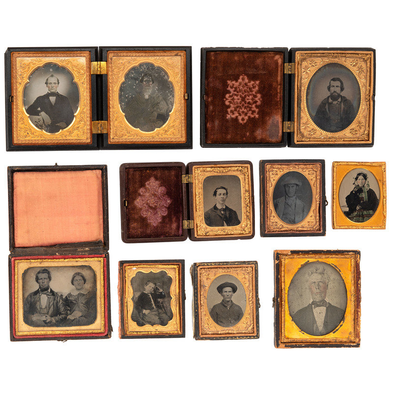 [EARLY PHOTOGRAPHY - PORTRAITURE]. An assorted group of 15 ambrotypes and tintypes featuring men, women, and children, including: