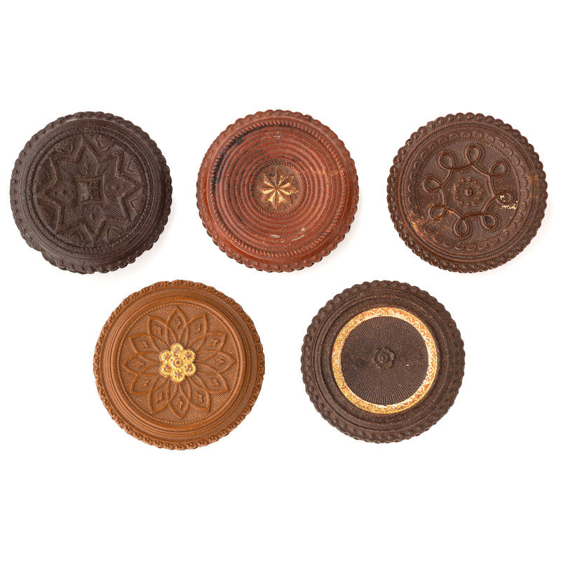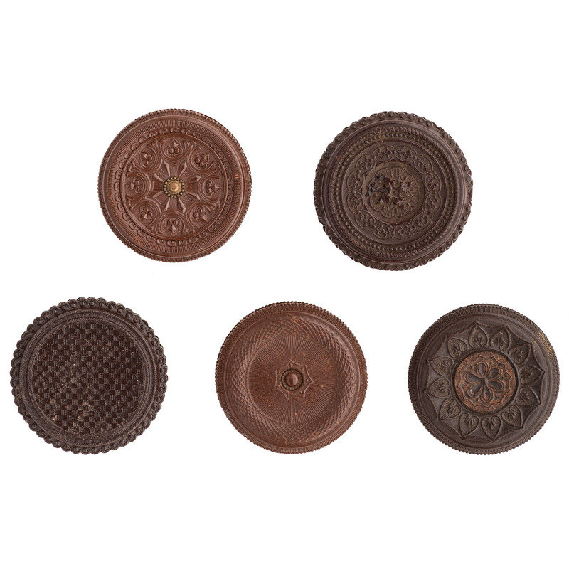 A Very Rare example with zinc embedded at center [Berg 3-541]; a Very Rare example with remnants of enamel at center [3-530E]; 7 Rare examples [3-502G, 3-507, 3-525G (discoloration), 3-534G, 3-532, 3-546 (discoloration), 3-553 (heavy soiling, loss to rim)]; and one Scarce example [3-527]. Conditions vary, though most include some light to moderate soiling and chipping.