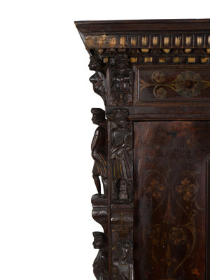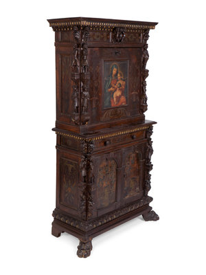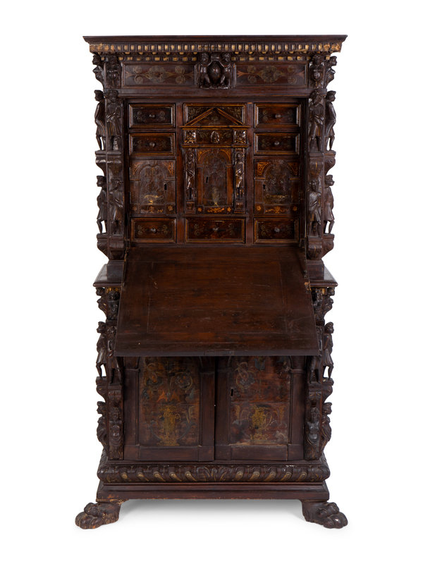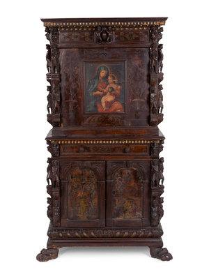A Spanish Colonial Style Carved Oak and Painted Vargueno Cabinet on Base