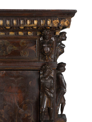 the upper door painted with Madonna and Child, the lower doors and panels with stylized floral decoration.