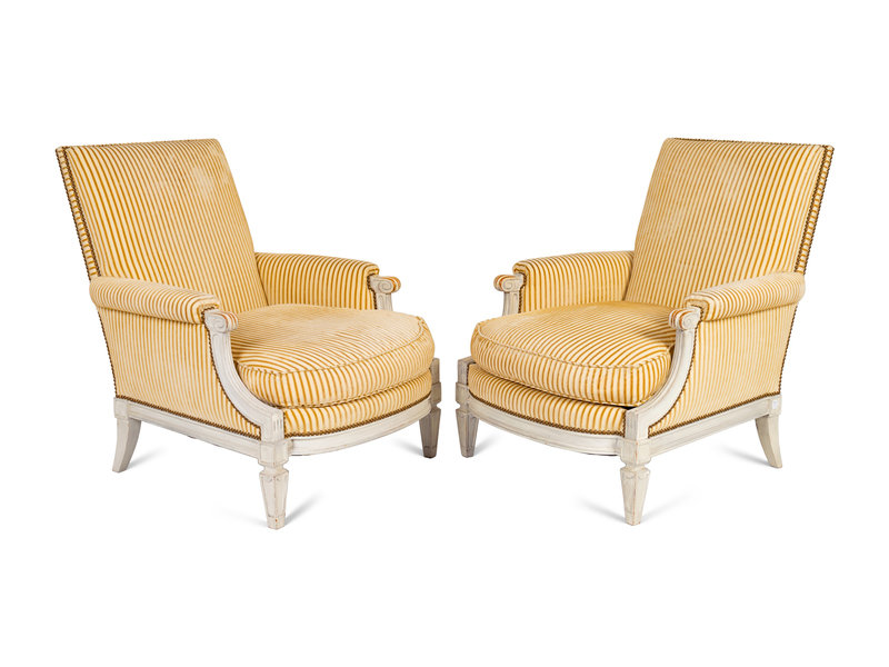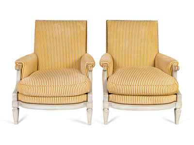 A Pair of Louis XVI Style Carved and Painted Bergeres