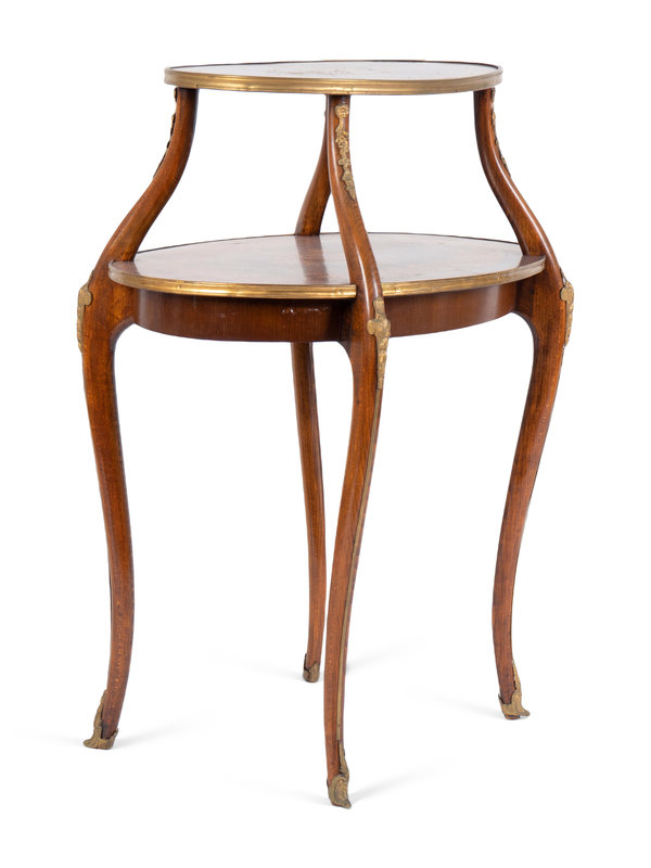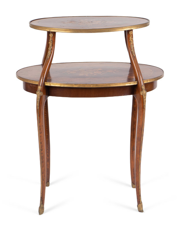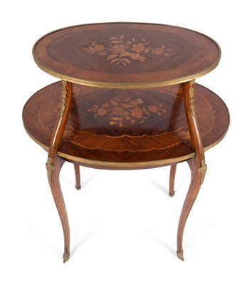 A Louis XVI Style Marquetry Two Tier Side Table with Gilt Bronze Mounts