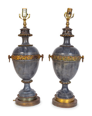 A Pair of Gilt Metal Mounted Grey Marble Urns