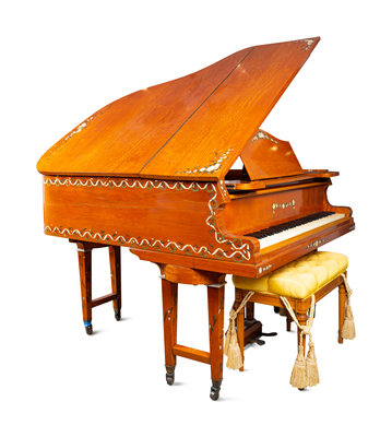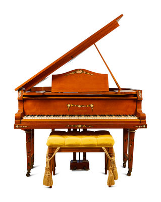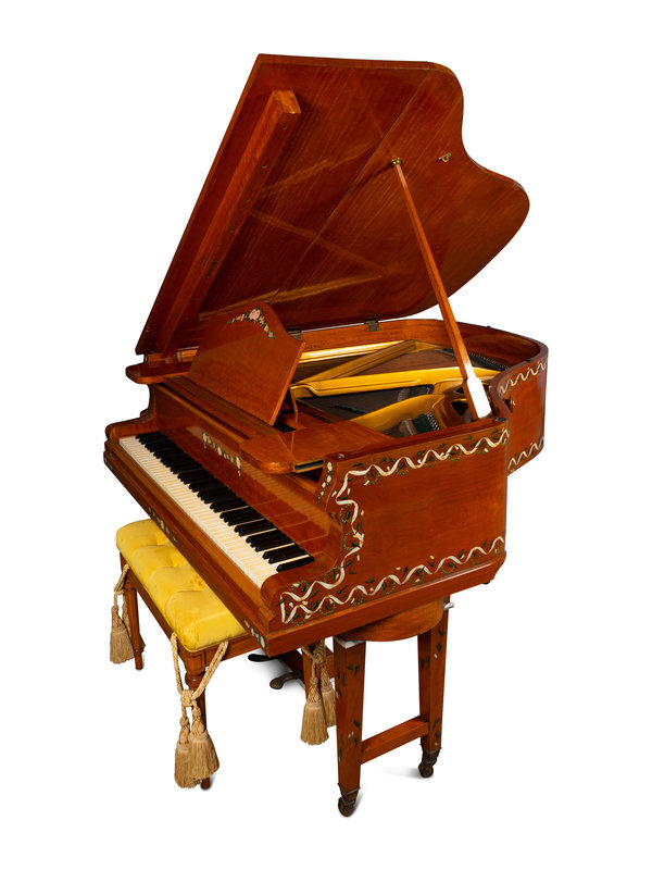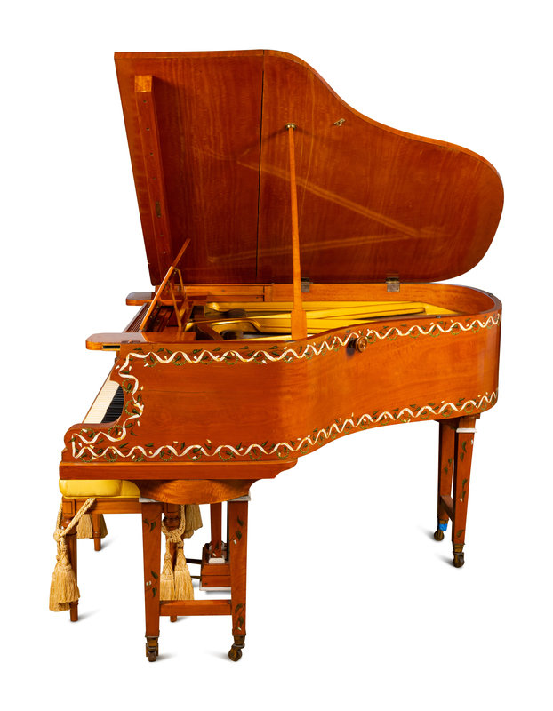 Possibly by Maple & Co., London; seven octave; with painted trailing floral, foliate and ribbon decoration; together with a piano bench.