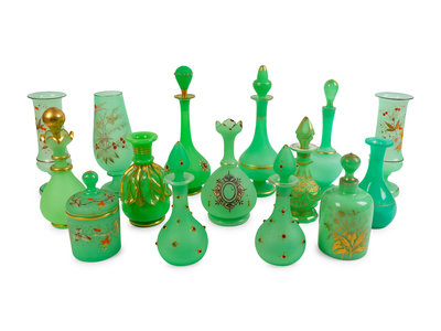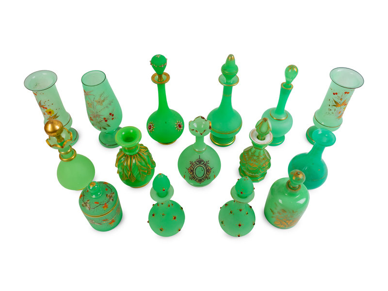 A Collection of Fifteen Green Opaline Glass Items