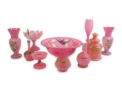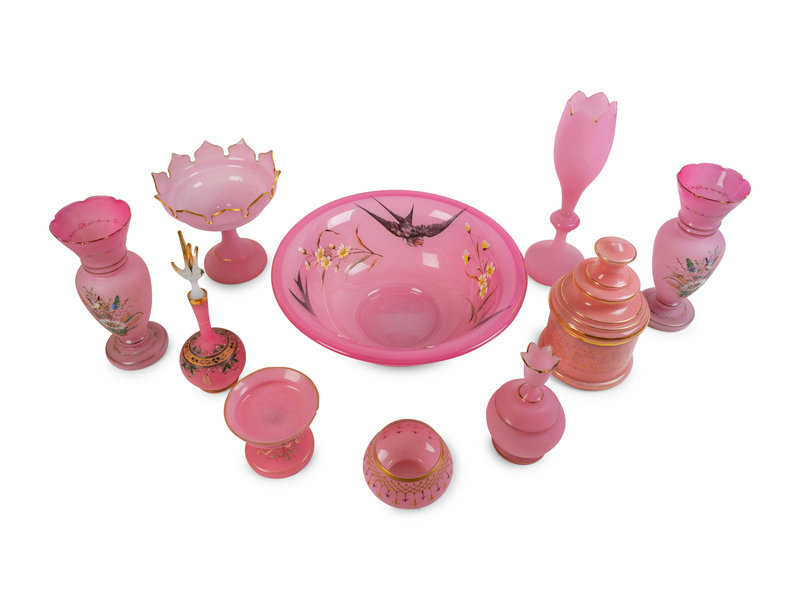 A Collection of Ten Pink Opaline Glass Items
