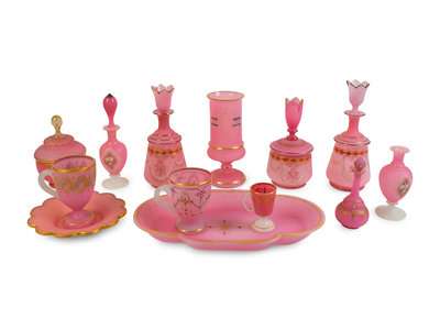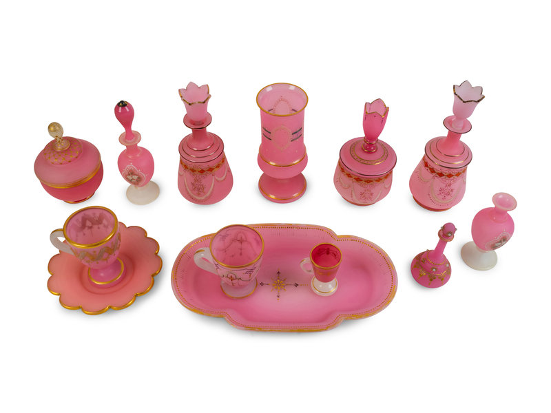 A Collection of Thirteen French Pink Opaline Glass Items