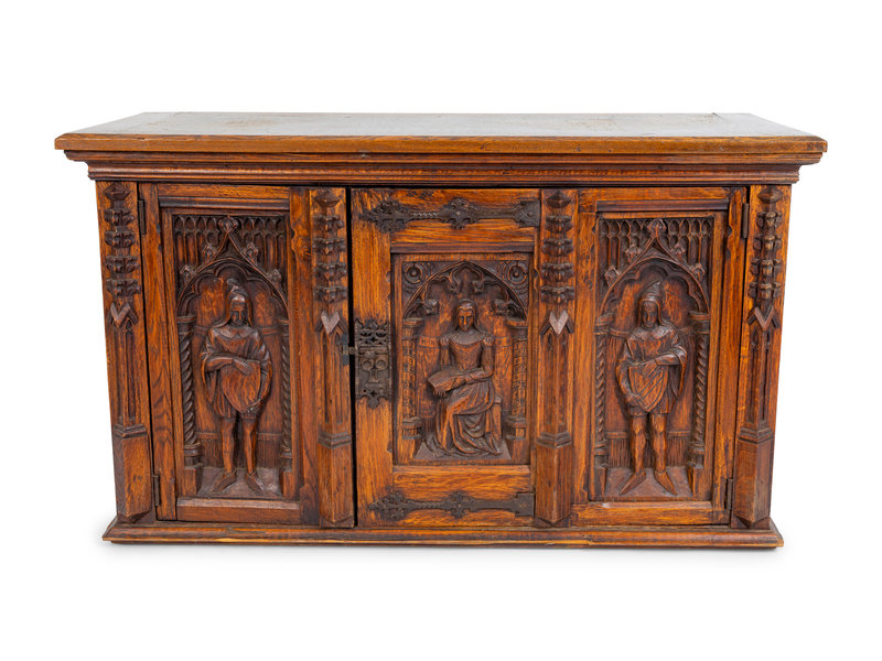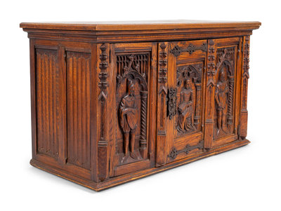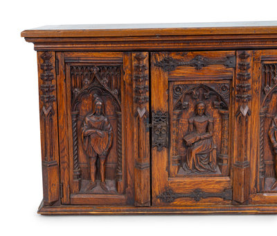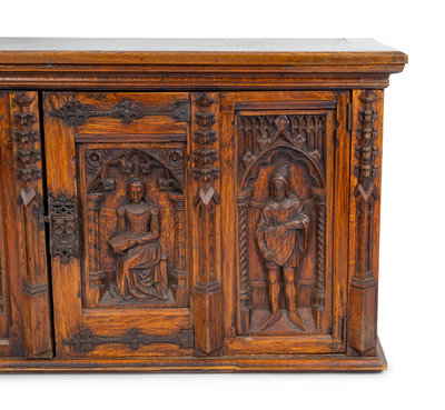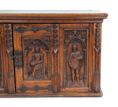 the front with carved figures, the sides with linen fold carving.