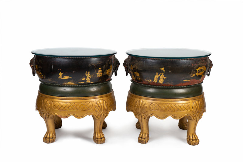 A Pair of English Lacquered and Chinoiserie Decorated Wine Cisterns on Giltwood Bases