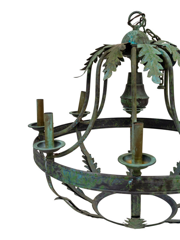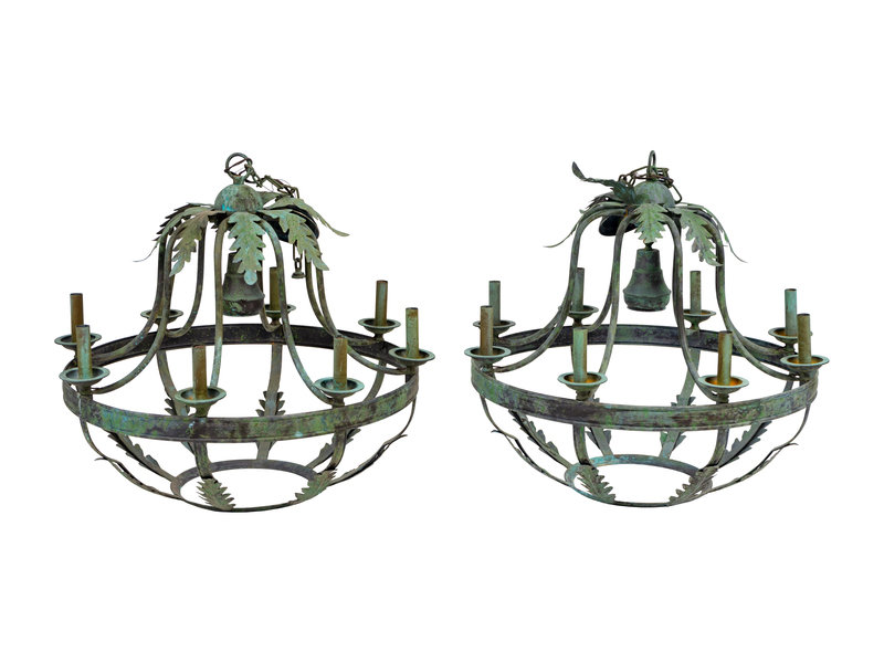 A Pair of Italian Baroque Style Green Patinated Iron Eight-Light Chandeliers