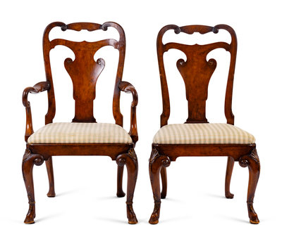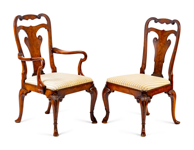 A Set of Six George II Style Walnut and Burl Veneer Dining Chairs