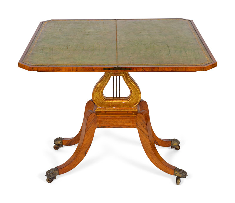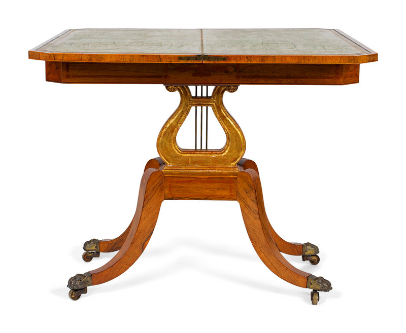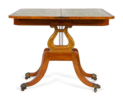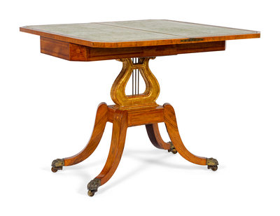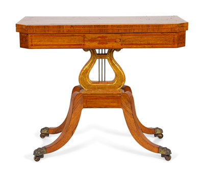 A Regency Style Satinwood Inlaid Parcel Gilt Rosewood Lyre-Base Flip Top Game Table