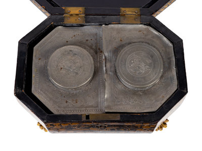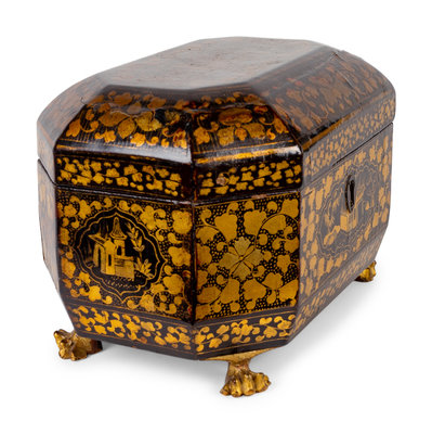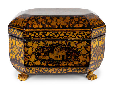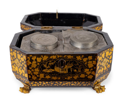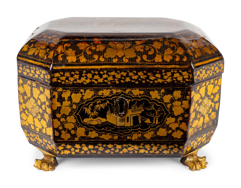 A Chinese Export Black and Gilt Lacquer Tea Caddy