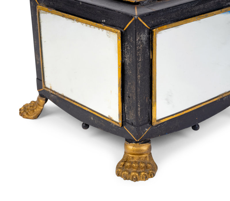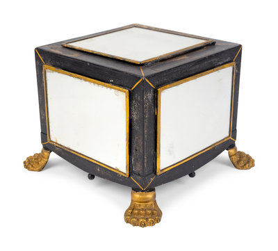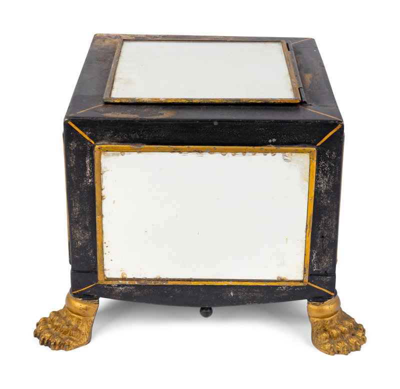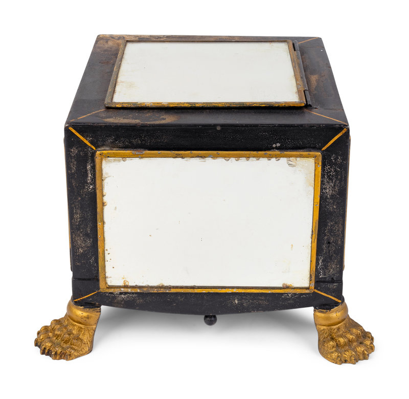 the top mirrored panel lifts to hollow interior; raised on gilt metal paw feet.