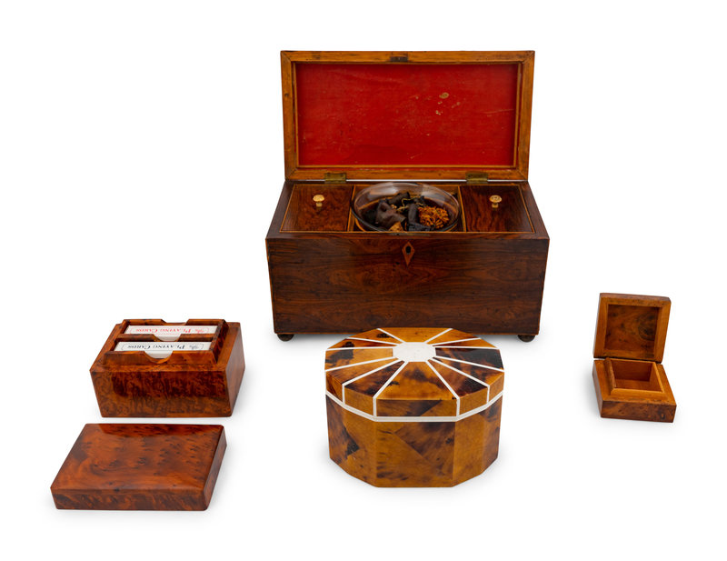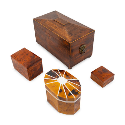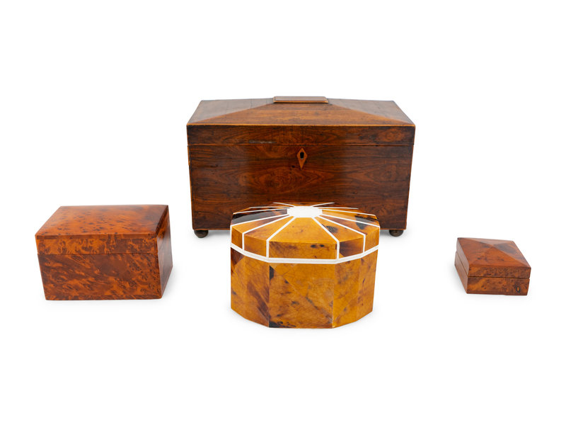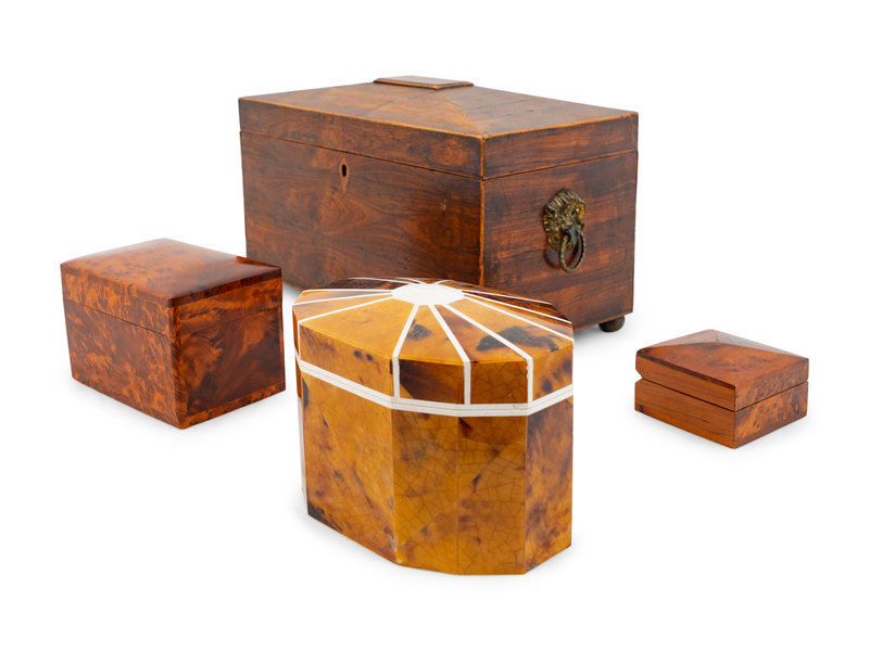 comprising a casket-form tea caddy, a faux-tortoise and bone inlaid tea caddy, a burlwood card holder and a small burlwood box.