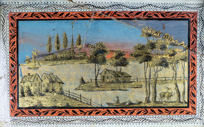 panel depicting a riverscape with cottages and deer.