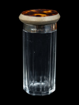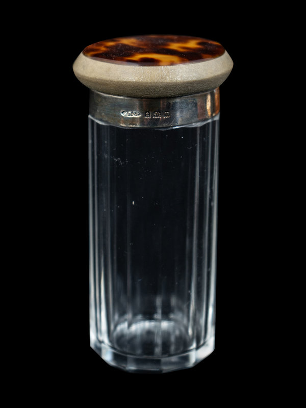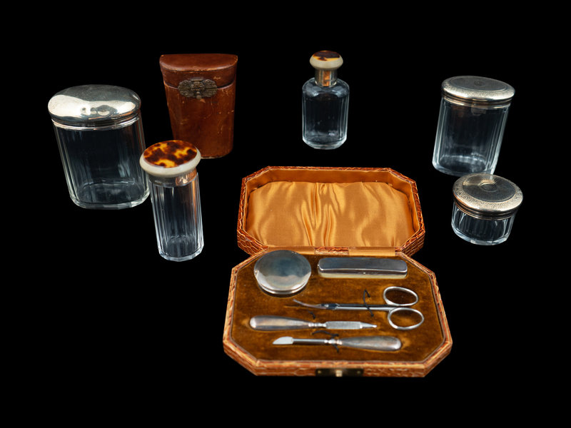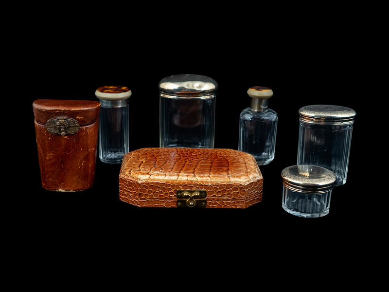 including four silver mounted glass jars, two tortoise mounted glass jars, a French perfume case and a petite travel grooming kit, 8 items total.