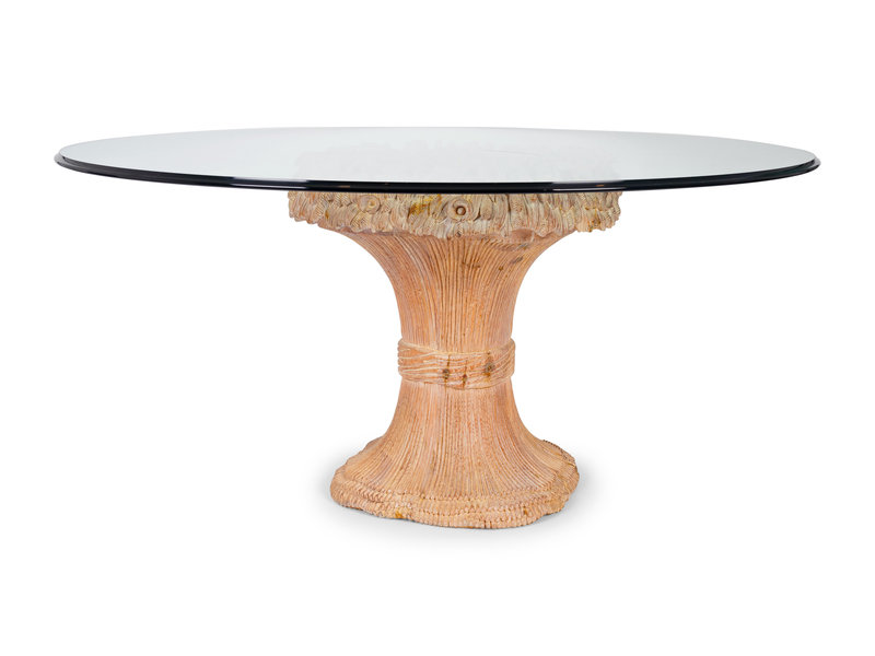 comprising a glass top table on a carved wood wheat sheath base, together with six beechwood dining chairs.