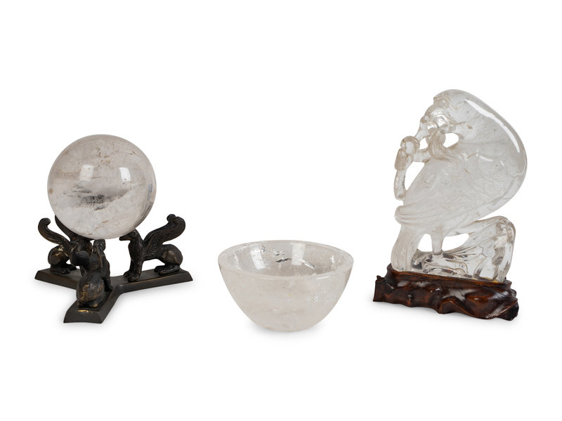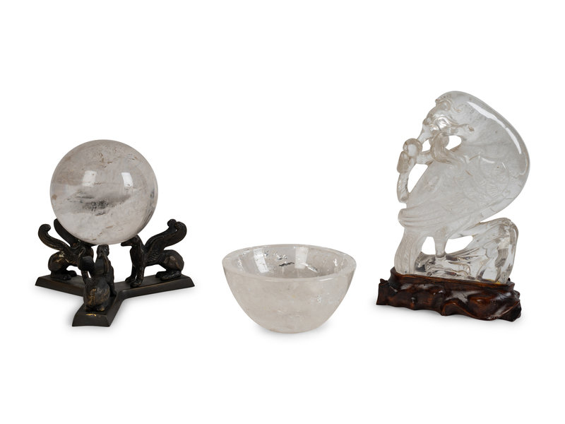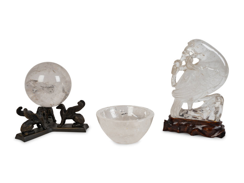 comprising a bowl, a globe mounted on bronze tri-sphinx base and parrot-form figure.