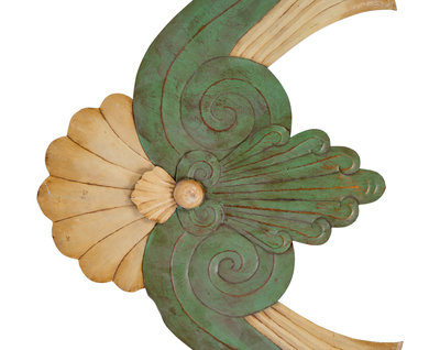 One with copper patina, bow-tied wreath decoration, the other painted tole shell and scroll mount.